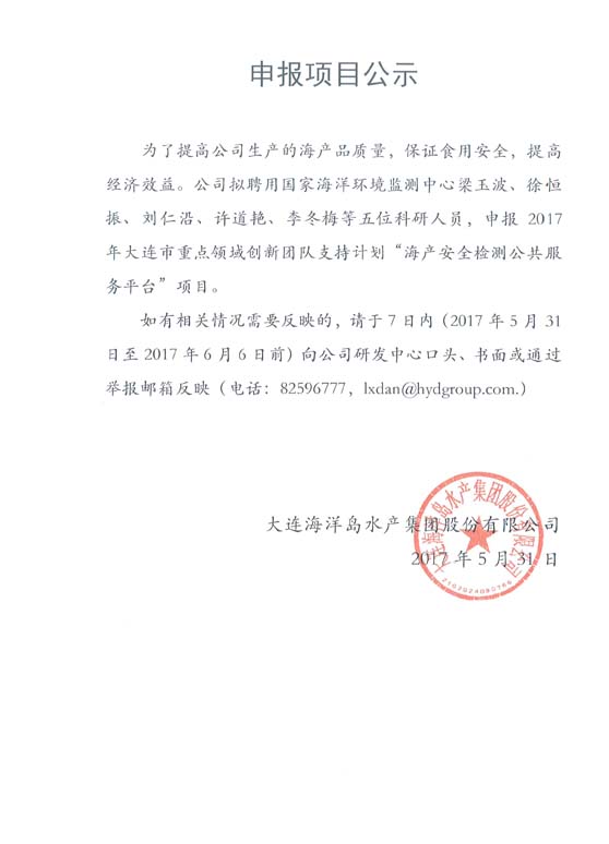 关于申报2017年大连市重点领域创新团队支持计划“海产安全检测公共服务平台”项目的公示