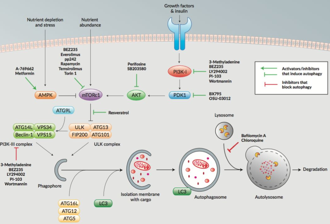 自噬5大关键过程:(1)自噬泡(phagophore)的形成:(2)Atg5-Atg12-Atg16L复合物形成并与自噬泡融合;(3)微管相关蛋白轻链3(microtubule-associatedprotein light chain3,LC3)由可溶解形式(LC3-I)转变为脂溶形式(LC3-II),与自噬泡结合形成自噬体。(4)自噬体捕获需降解或清除的蛋白质、细胞器等物质;(5)自噬体与溶酶体结合形成自噬溶酶体。具体分子机制请看下图。